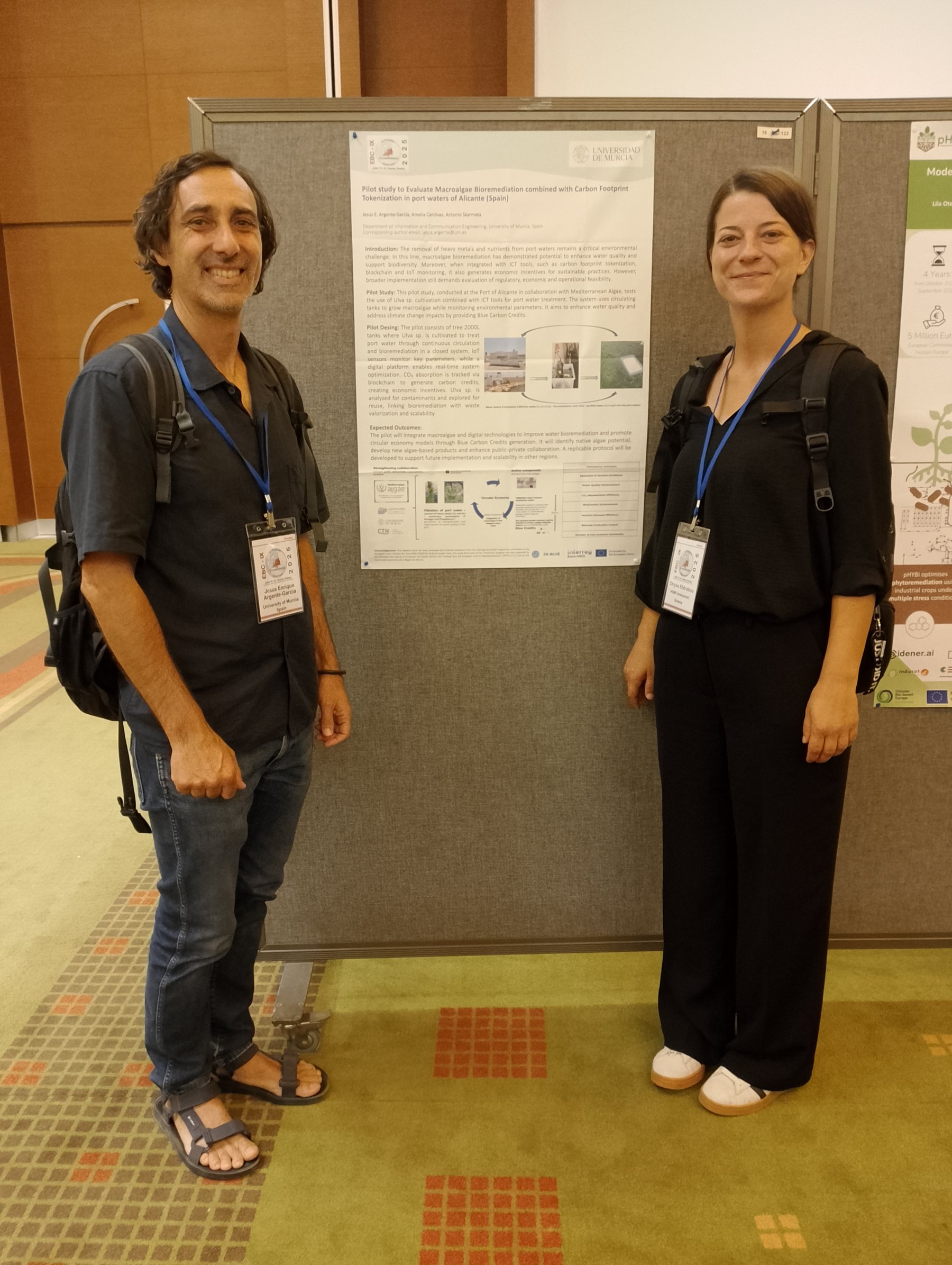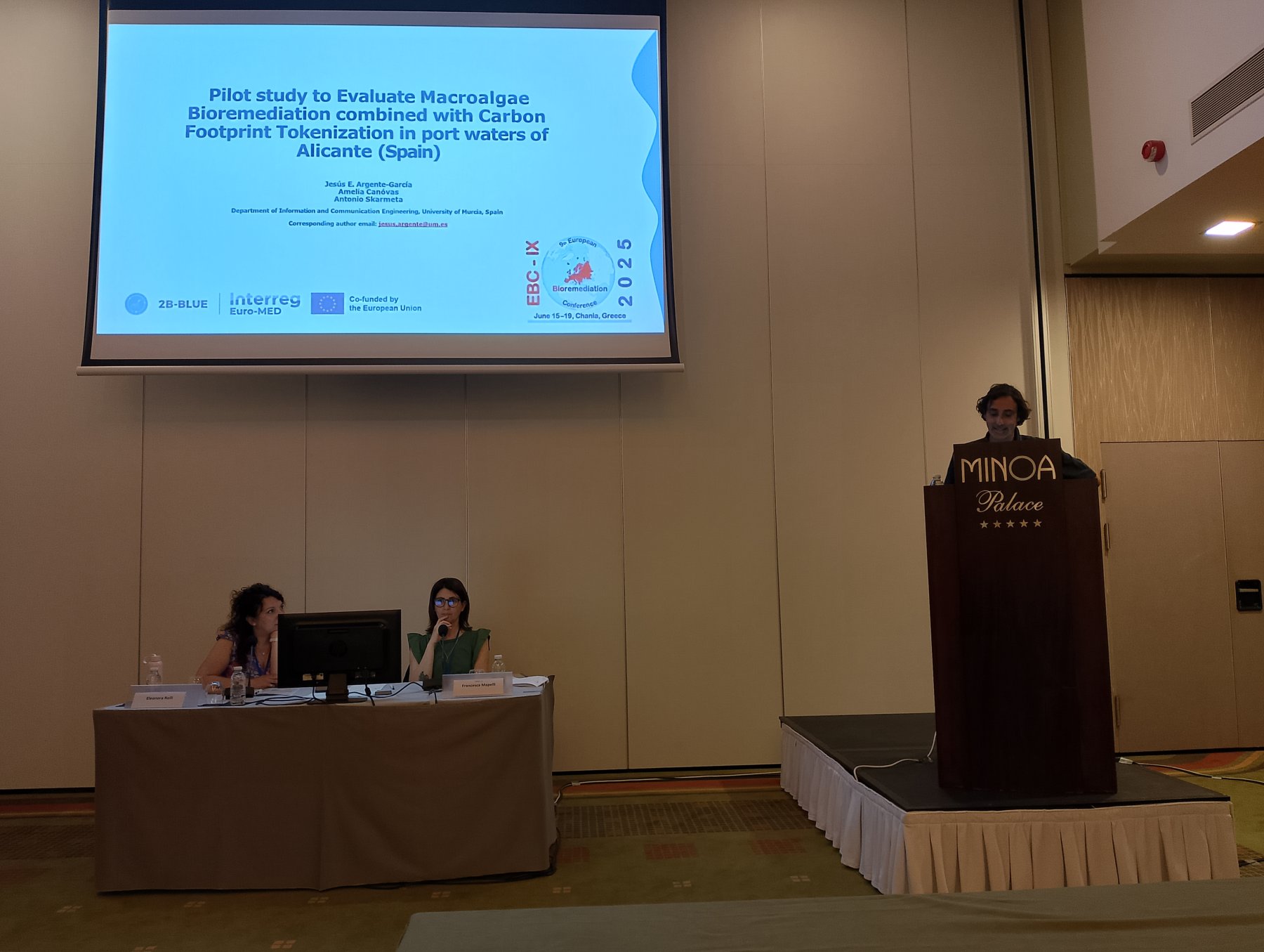 At the 9th European Bioremediation Conference (EBC-IX) in Chania, Crete, 2B-BLUE project partners showcased national pilot projects advancing marine biotechnology and the Mediterranean bioeconomy. Dr. Jesús Argente-García (University of Murcia) presented a pilot using macroalgae to clean port waters in Alicante, Spain. The study also integrates carbon footprint tokenization, linking marine bioremediation with digital sustainability tools. Chrysa Efstratiou (Hellenic Centre for Marine Research) highlighted integrated mussel–sea cucumber farming in Greece, a nature-based approach to sediment restoration and biomass production. These initiatives, featured in sessions on Phytoremediation and Circular Economy, illustrate the promise of marine-based, sustainable solutions for ecosystem restoration.